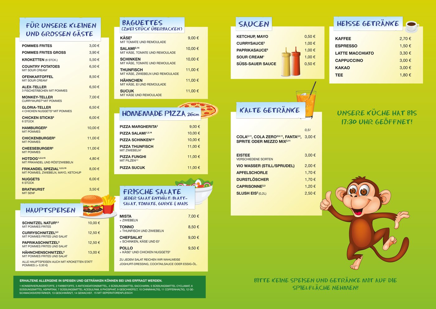 Spielen macht bekanntlich hungrig und durstig, darum bieten wir in unserem Monkey-Bistro zu Familien freundlichen Preisen leckere Snacks wie selbstgemachte Pizza, Pommes, Chicken Nuggets und vieles mehr sowie Kaltgetränke und Eis. Neben Durstlöschern gibt es natürlich auch warme Getränke für die Erwachsenen wie Kaffee, Latte Macchiato, Milchkaffee, Tee oder Kakao. Für jeden Geschmack ist garantiert etwas dabei.